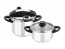 Set de dos ollas a presión rápidas, de 7 y 4 litros, fabricadas en acero inoxidable 18/10 con apertura fácil y triple fondo difusor, aptas para todo tipo de fuegos incluido inducción.
